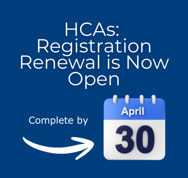 The Registration Renewal Form Is Available for Current HCAs February 9 – April 30, 2026. In This Article Who Needs to Complete the Registration Process? When Can I Complete the Registration Process? What Is the Cost? How Can I Pay...